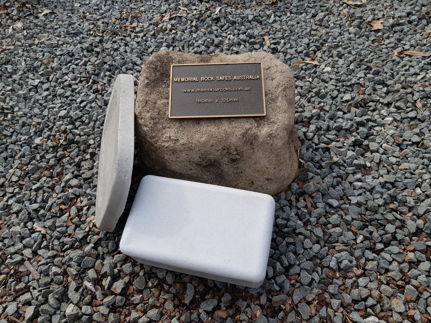 Memorial Rock Urns are a loving practical alternative for the safe keeping of a loved one's ashes. This Memorial rock has an incorporated flat space for up to a 150mm x 100mm x 4.5mm Plaque or our small heart plaque. (150mm x 100mm) PLAQUE SOLD SEPARATELY The blue plastic standard Australian sized cremation urn seen in the pictures demonstrate...