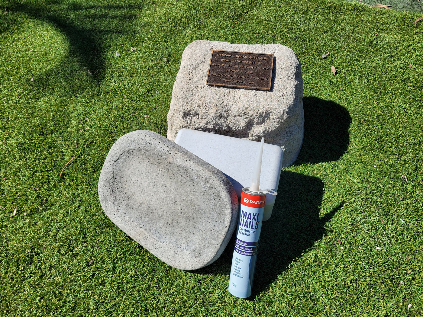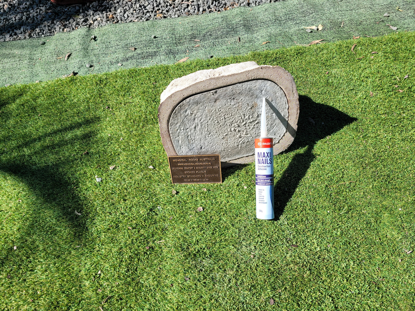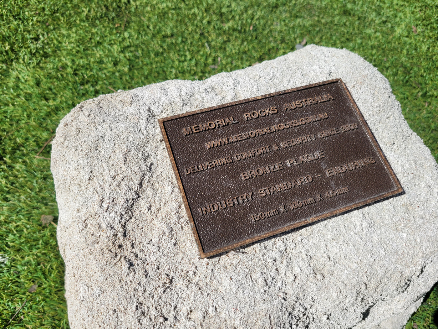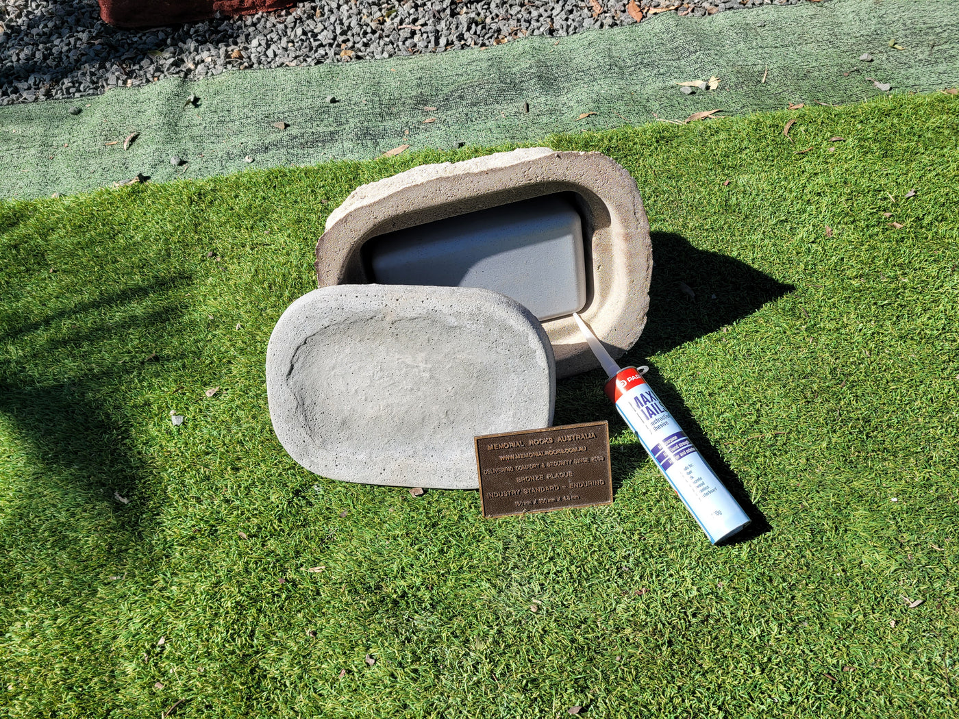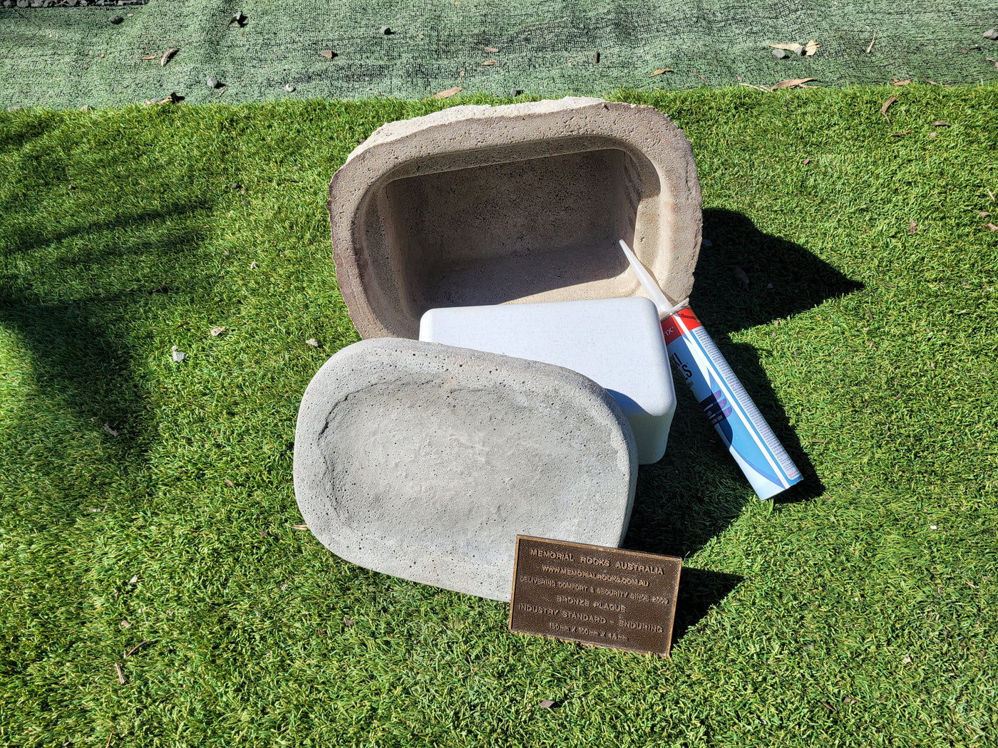 Memorial Rock Urns are a loving practical alternative for the safe keeping of a loved one's ashes. This Memorial rock has an incorporated flat space for up to a 180mm x 120mm x 4.5mm Plaque or our large heart plaque. PLAQUE SOLD SEPARATELY The blue plastic standard Australian sized cremation urn seen in the pictures demonstrates the size of t...