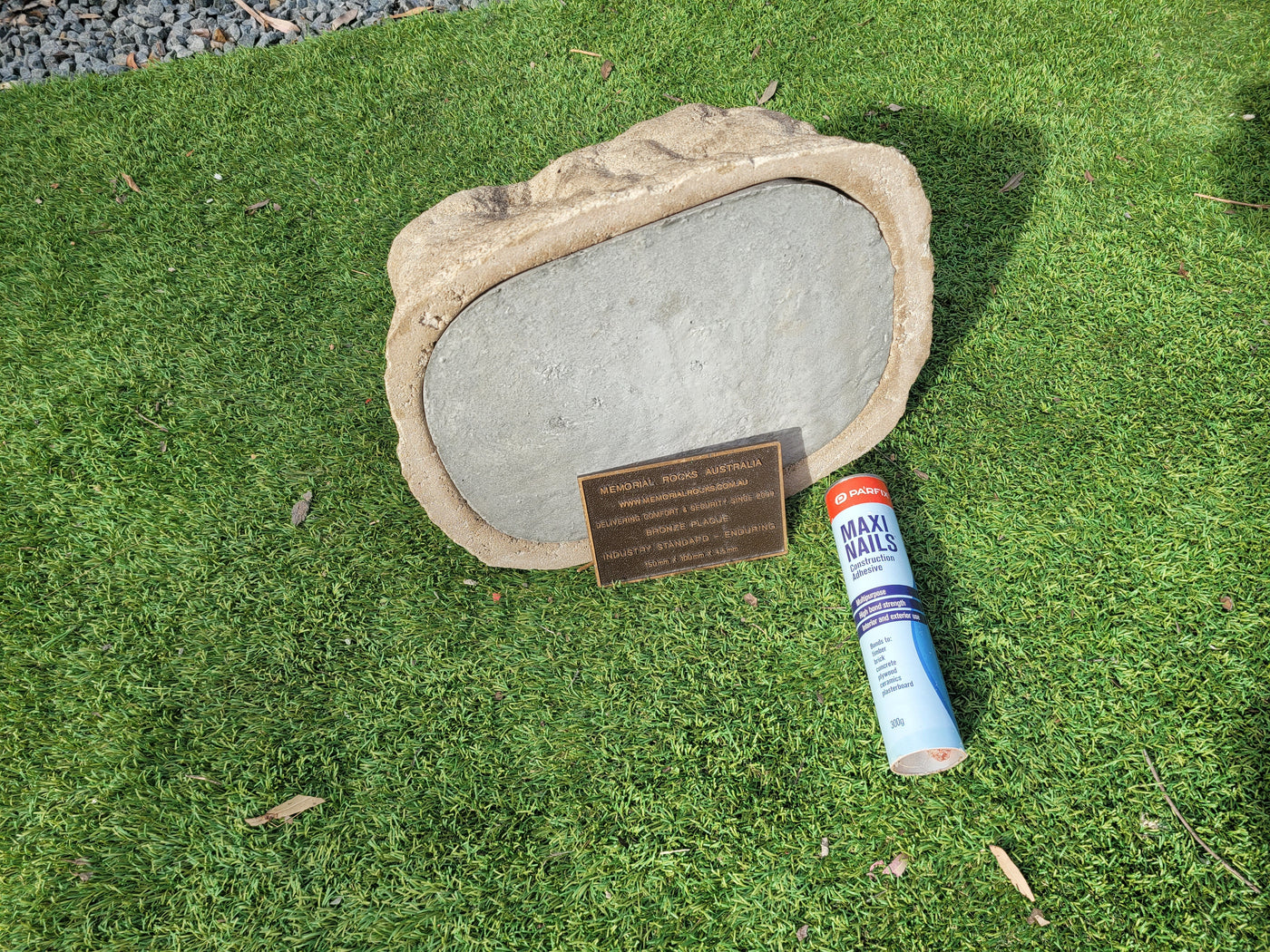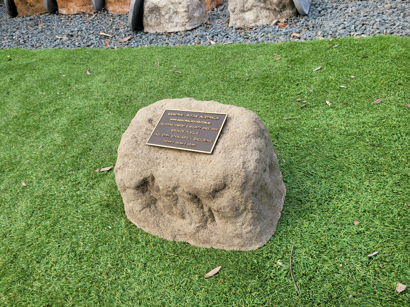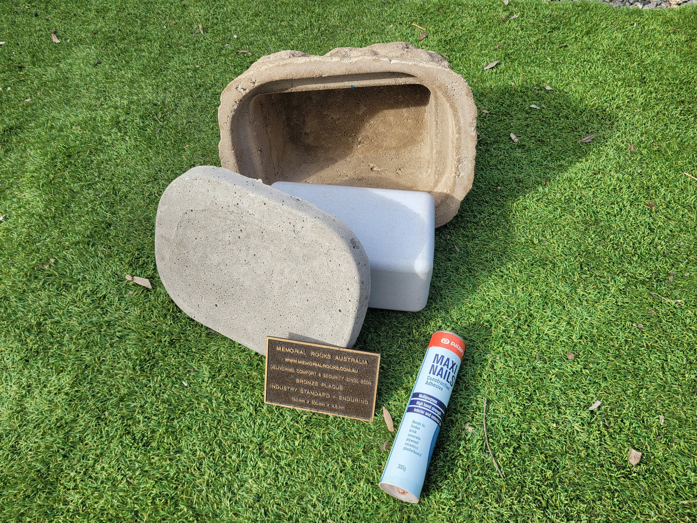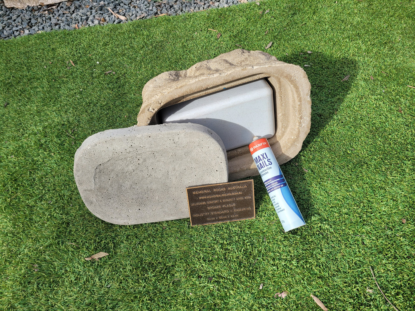 Memorial Rock Urns are a loving practical alternative for the safe keeping of a loved one's ashes. This Memorial rock has an incorporated flat space for up to a 180mm x 120mm x 4.5mm Plaque or our large heart plaque. PLAQUE SOLD SEPARATELY The blue plastic standard Australian sized cremation urn seen in the pictures demonstrates the size of t...