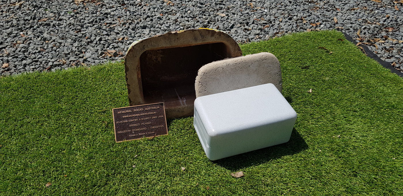 Memorial Rock Urns are a loving practical alternative for the safe keeping of a loved one's ashes. This Memorial Rock Urn has a small internal sealed container for partial ash interment. This Partial Ash Urn Memorial rock has an incorporated flat space for a 100 mm x 75mm x4.5mm industry standard bronze plaque. Proudly Australian made, origin...