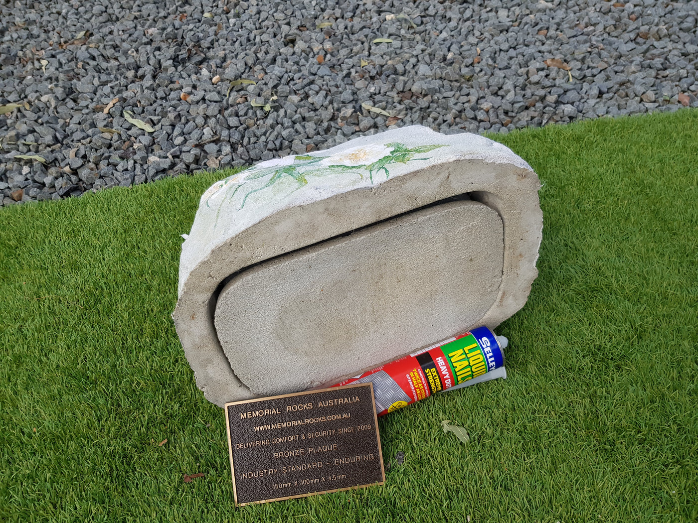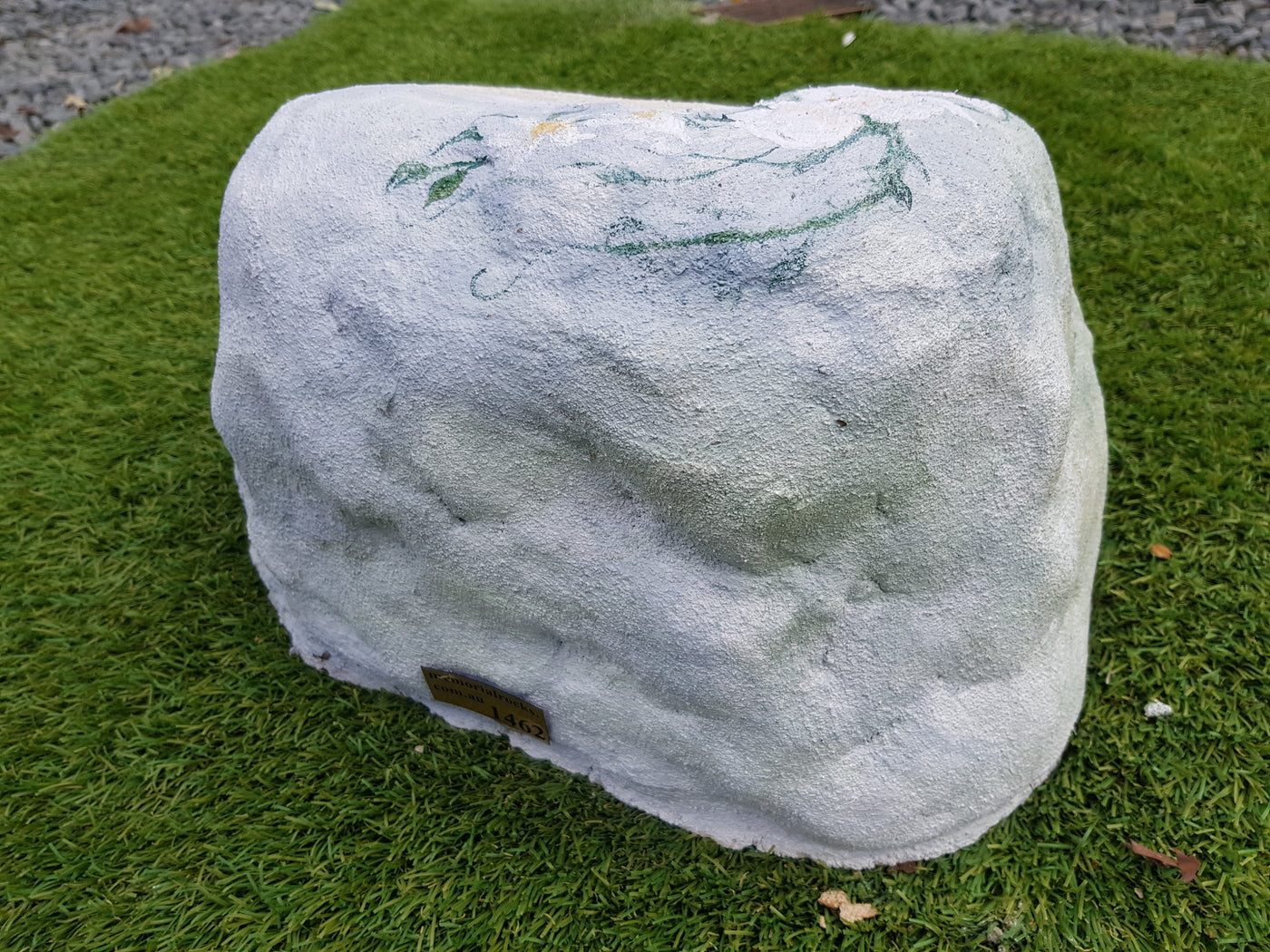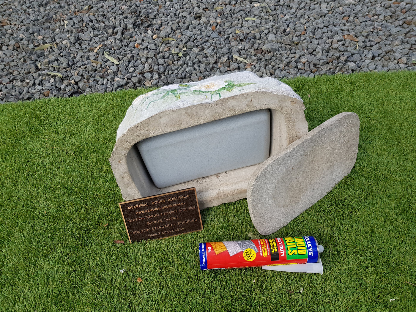 Memorial Rock Urns are a loving practical alternative for the safe keeping of a loved one's ashes. This Memorial Rock Urn has a small internal sealed container for partial ash interment. This Partial Ash Urn Memorial rock has an incorporated flat space for a 100 mm x 75mm x4.5mm industry standard bronze plaque. PLAQUE SOLD SEPARATELY Proudly...