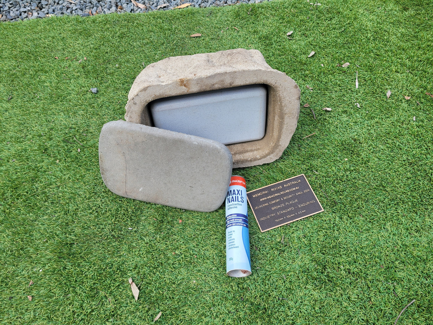 Memorial Rock Urns are a loving practical alternative for the safe keeping of a loved one's ashes. This Memorial rock has an incorporated flat indented recess space for a 150mm x 100mm x4.5mm industry standard bronze plaque. PLAQUE SOLD SEPARATELY Proudly an Australian made, original product. Operating since 2009. Regular size. Lightweight (a...