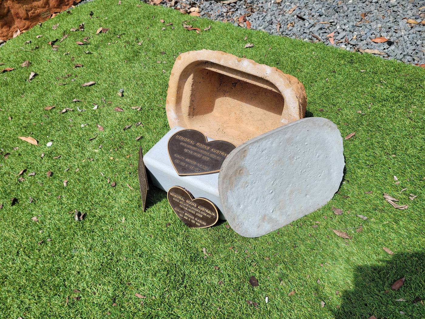 Memorial Rock Urns are a loving practical alternative for the safe keeping of a loved one's ashes. This Memorial rock has an incorporated flat space for up to a 150mm x 100mm x 4.5mm Plaque or our small heart plaque. (150mm x 100mm) PLAQUE SOLD SEPARATELY The blue plastic standard Australian sized cremation urn seen in the pictures demonstrate...