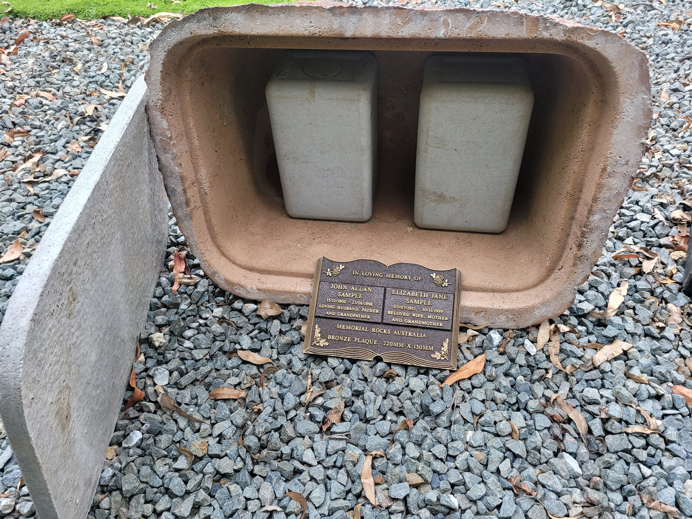 Proudly an original Australian product idea operating since 2009. Extra-Large Size Weight (approx. 30 kg) Memorial Rock/Stone/Urn with a sealable internal cavity for the safe-keeping of a loved one's ashes. Holds one or two or three standard Australian sized ash containers (as demonstrated in photos), plus memorabilia. Size Approx. 600mm x 440...
