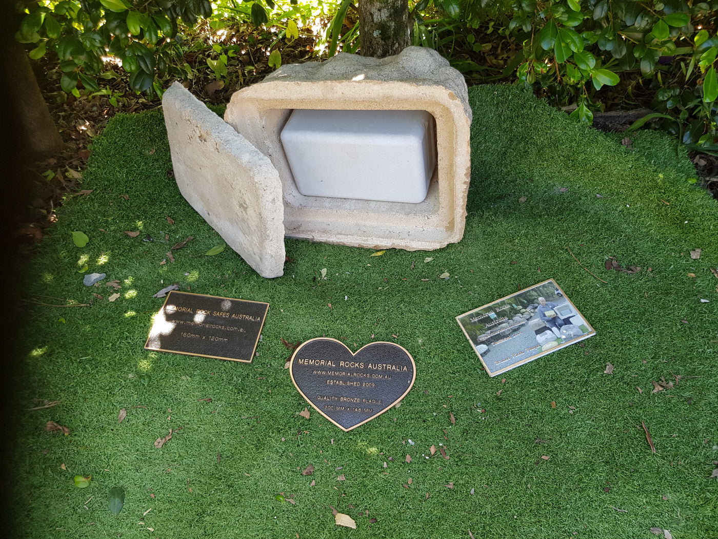 Proudly an original Australian product idea operating since 2009. Large Single Size Approx. 24 kg. Memorial Rock/Stone/Urn with a sealable internal cavity for the safe-keeping of a loved one's ashes. Holds one standard Australian sized ash container, plus memorabilia. Size Approx. 450mm x 390mm x 300mm (external). 270mm x 230mm x 170mm (interna...