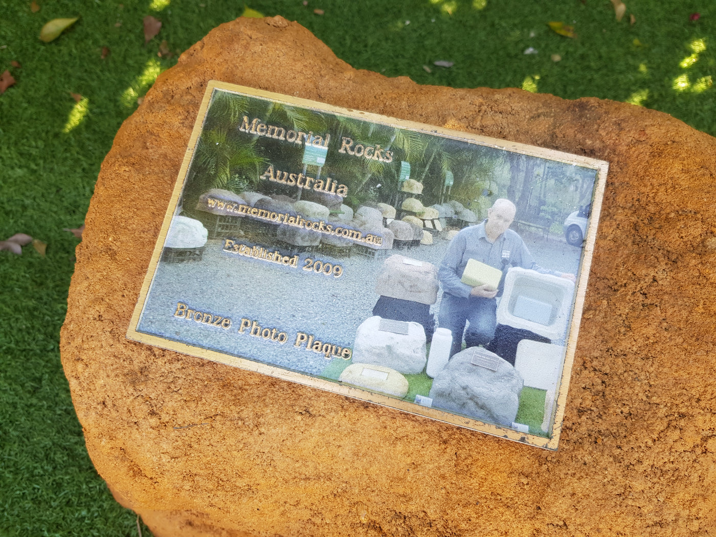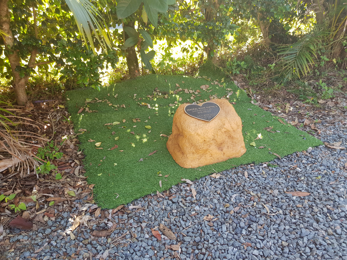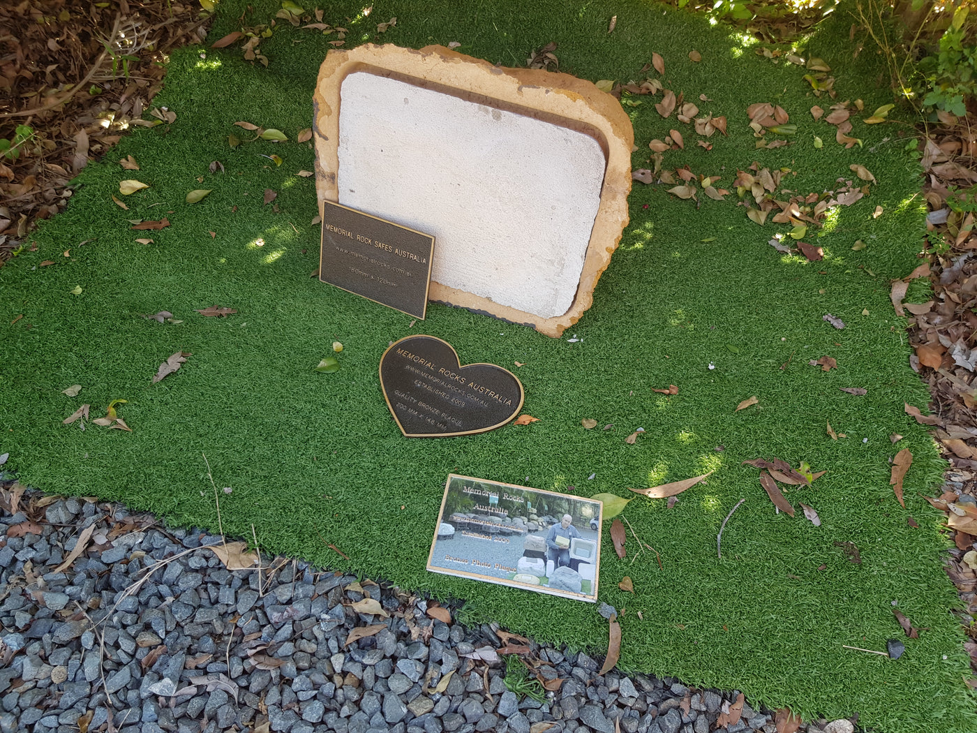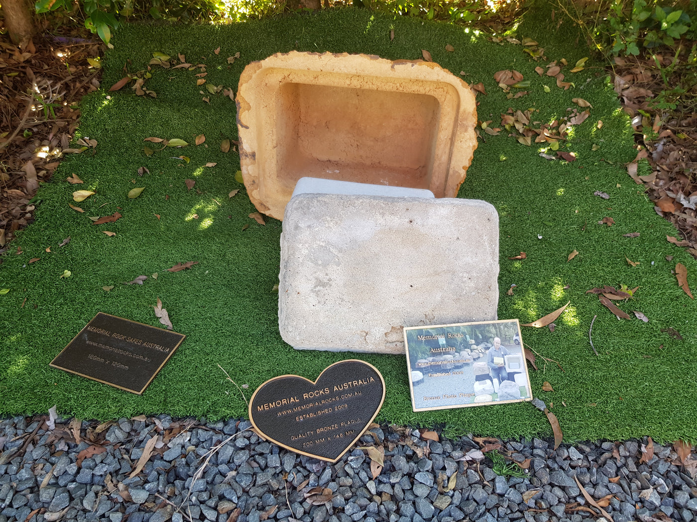 This Memorial Rock Urn has a useable flat section for a recommended 180mm x 120mm x 4.5mm  industry standard quality bronze plaque or our 200mm x 148mm x 4.5mm  heart plaque.