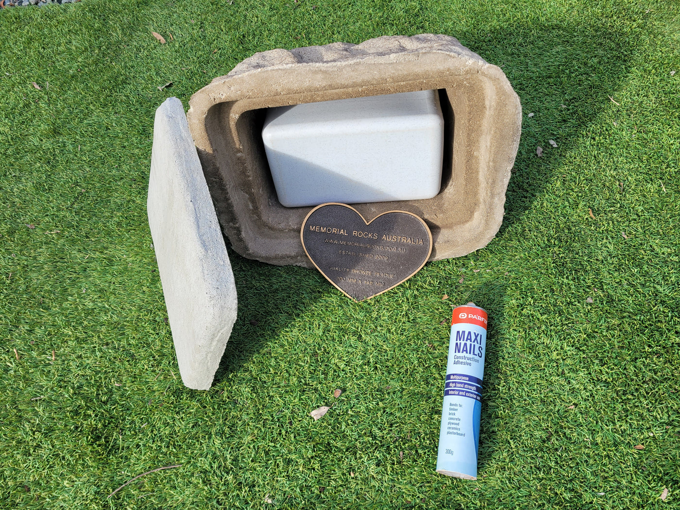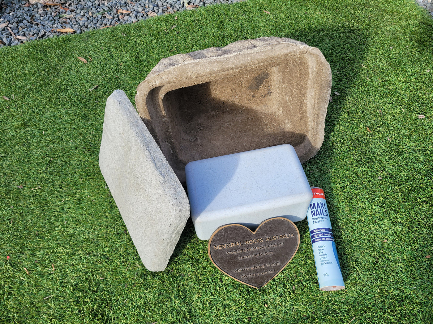 Approx. 24 kg. Memorial Rock/Stone/Urn with a sealable internal cavity for the safe-keeping of a loved one's ashes. Holds one standard Australian sized ash container, plus memorabilia.