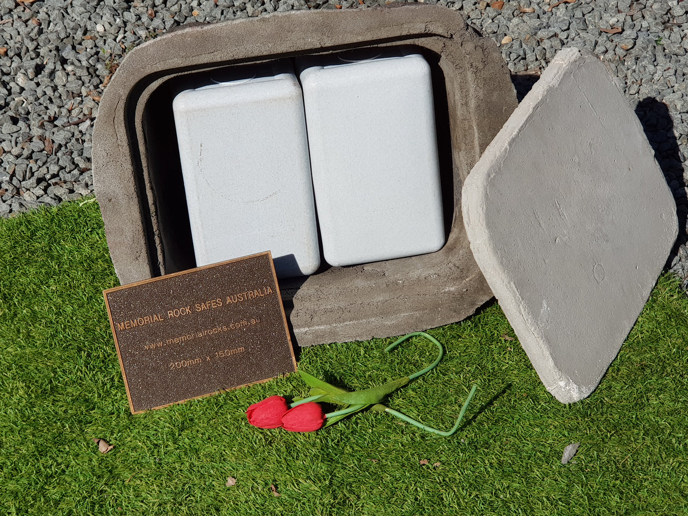 Memorial Rock/Stone/Urn with a sealable internal cavity for the safe-keeping of a loved one's ashes. Holds one or two standard Australian sized ash containers, plus memorabilia.
