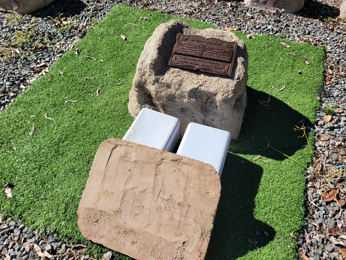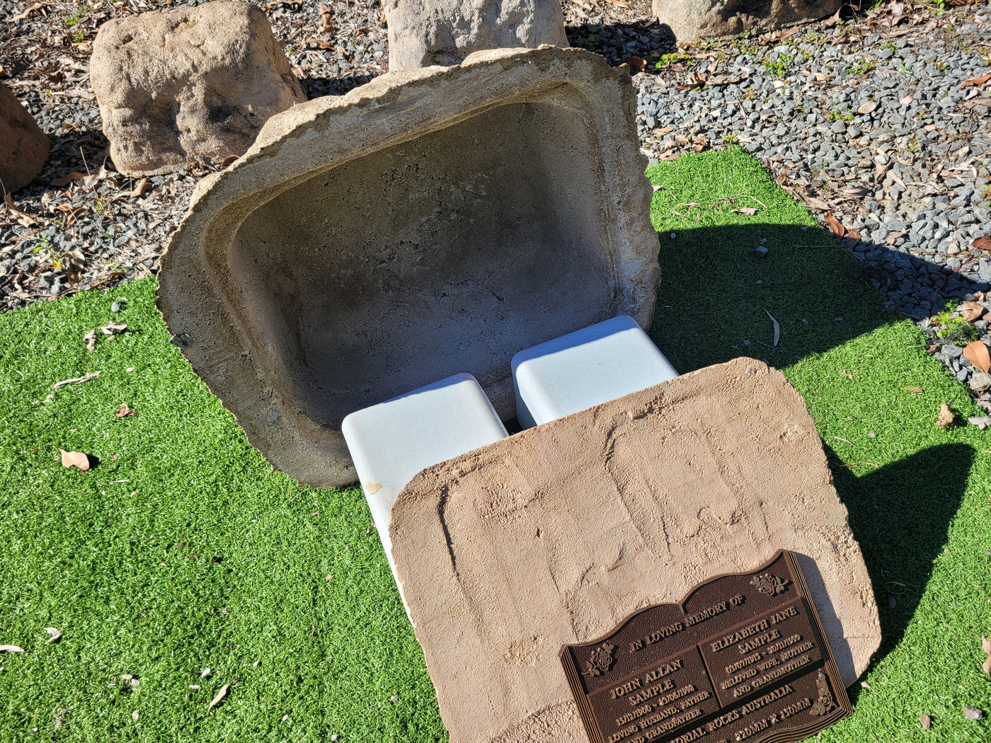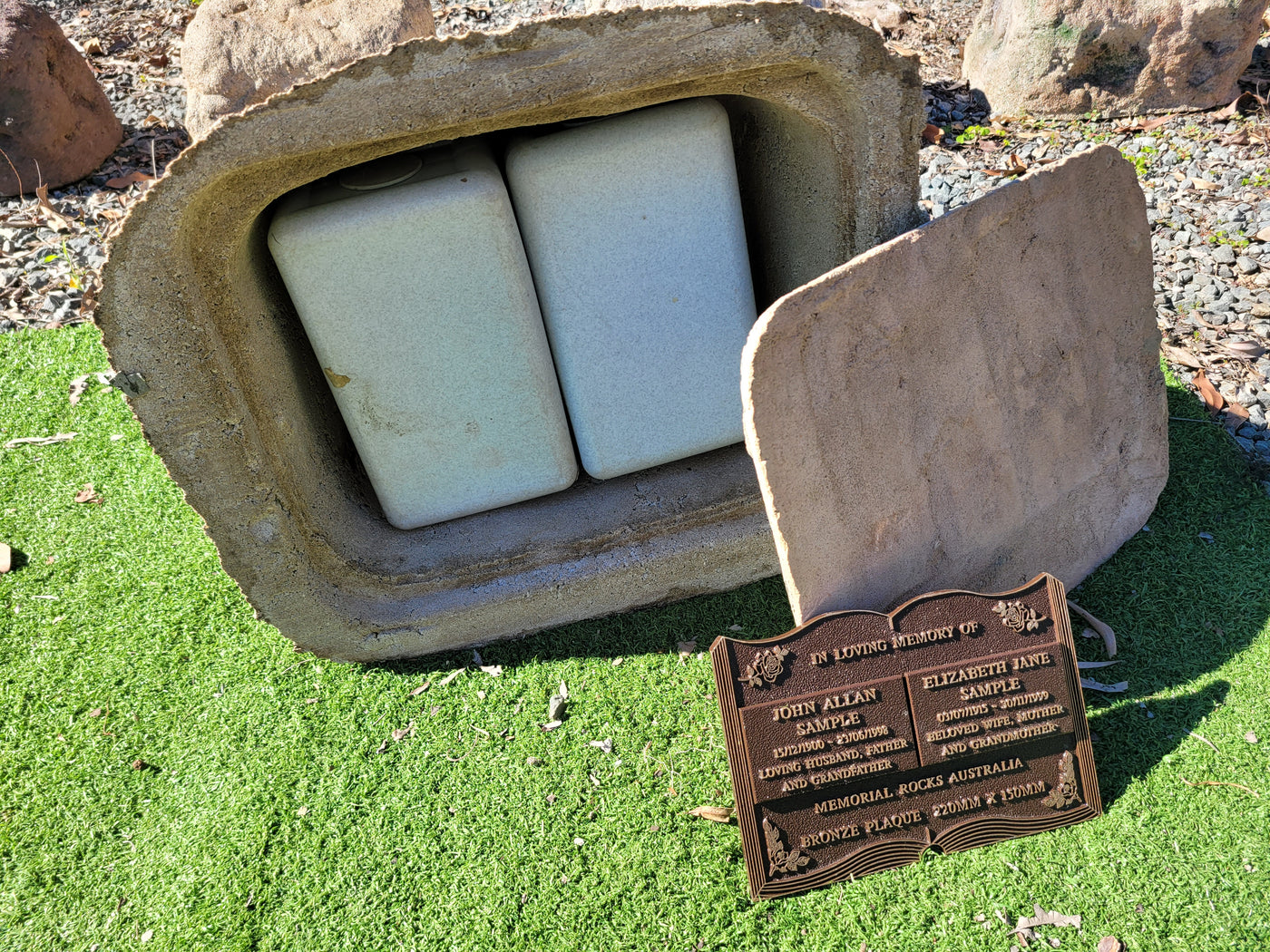 This Memorial Rock Urn has a useable flat section up to 220mm x 150mm for a quality bronze plaque or 2 smaller plaques (to perhaps accommodate a 2nd plaque at a much later time) and or a picture. Suggested size for a single plaque 200mm x150mm. SOLD SEPARATELY.