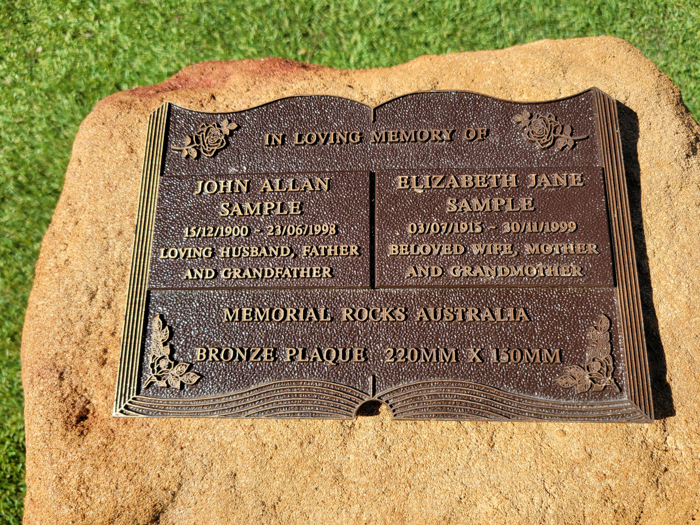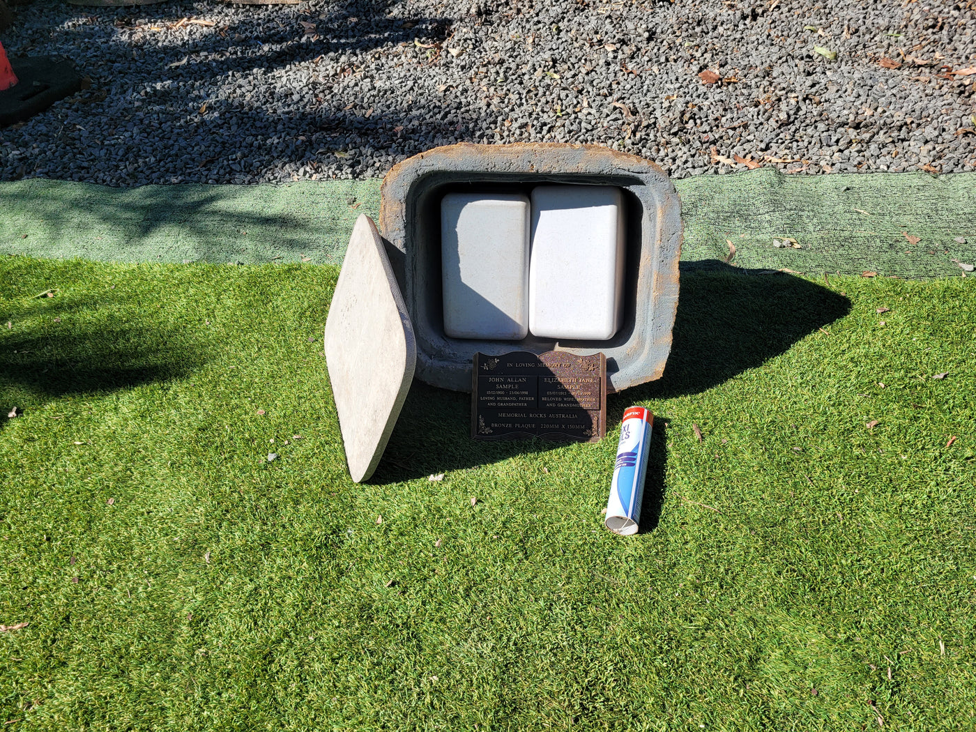This Memorial Rock Urn has a useable flat section up to 220mm x 150mm for a quality bronze plaque or 2 smaller plaques (to perhaps accommodate a 2nd plaque at a much later time) and or a picture. Suggested size for a single plaque 200mm x150mm. SOLD SEPARATELY.