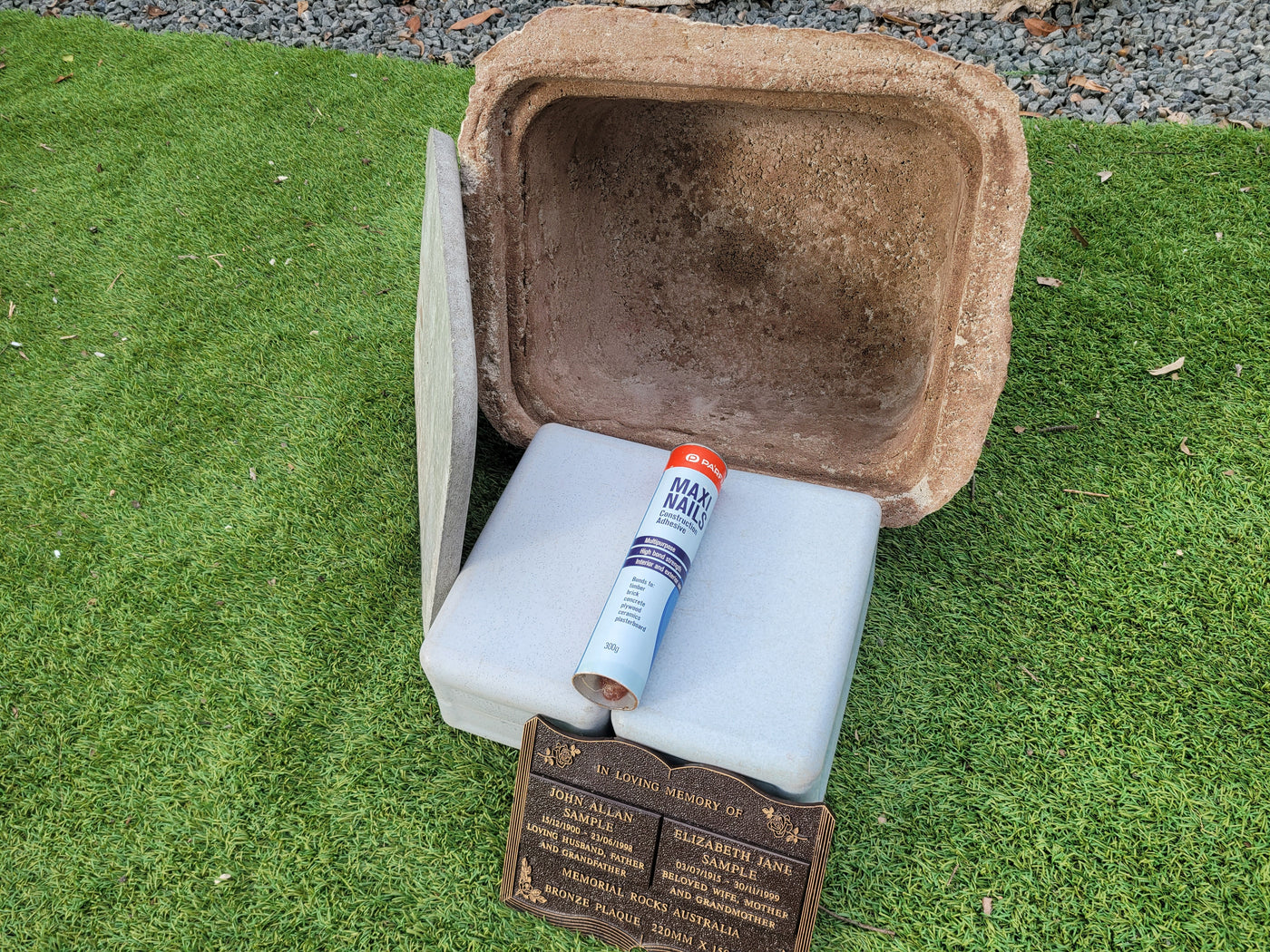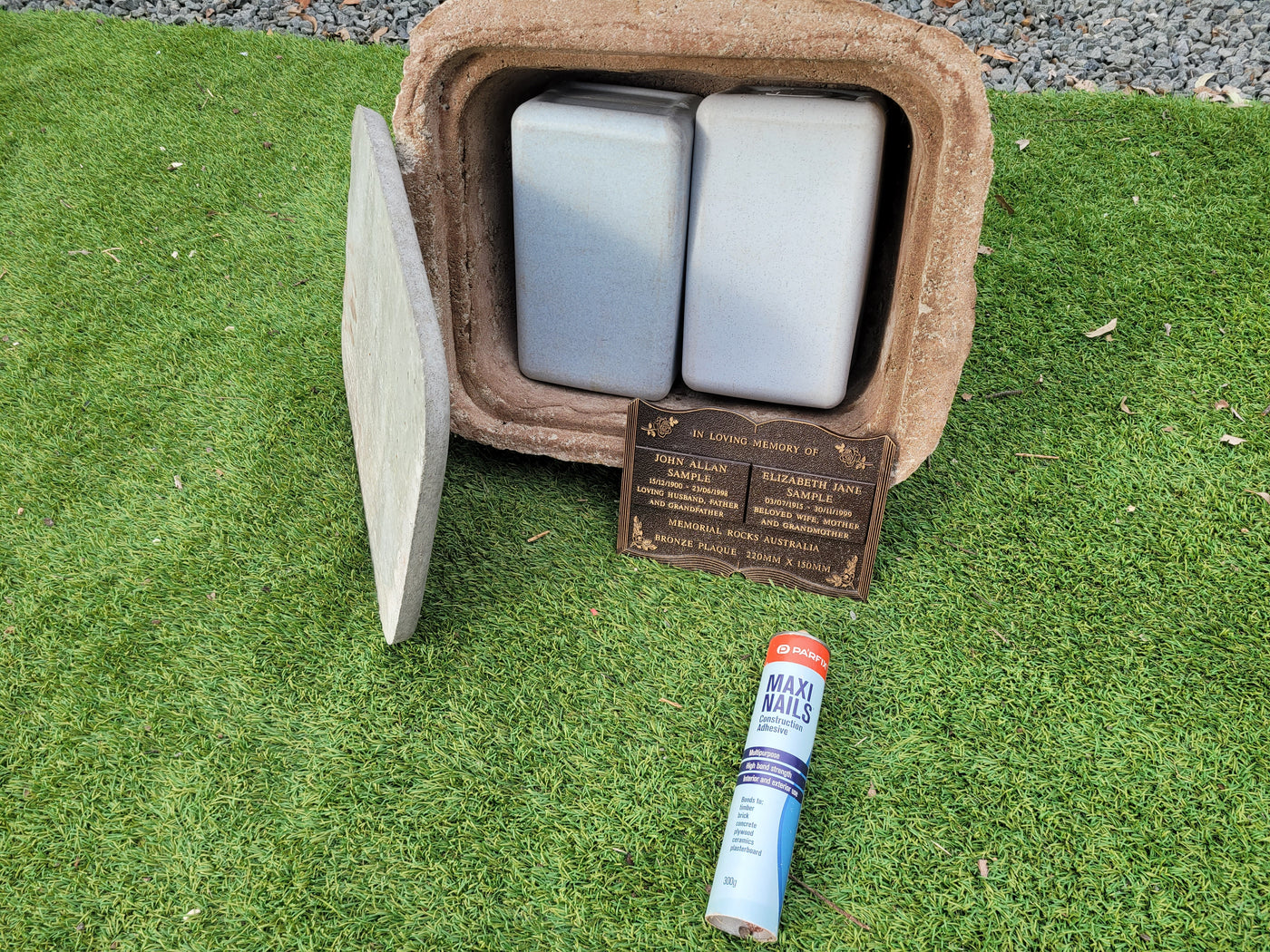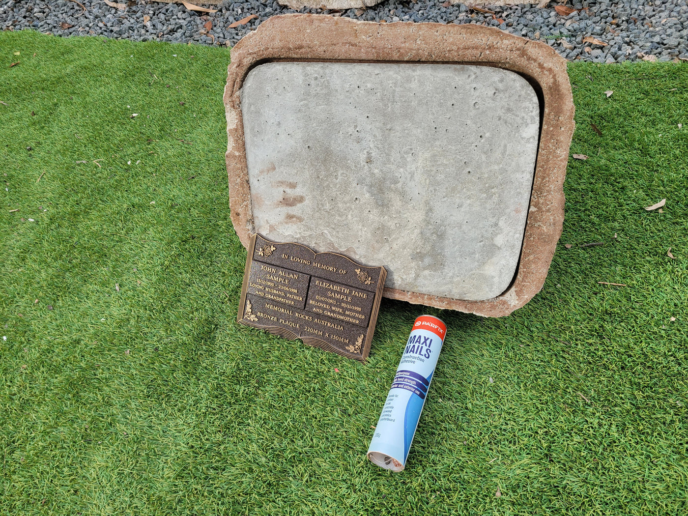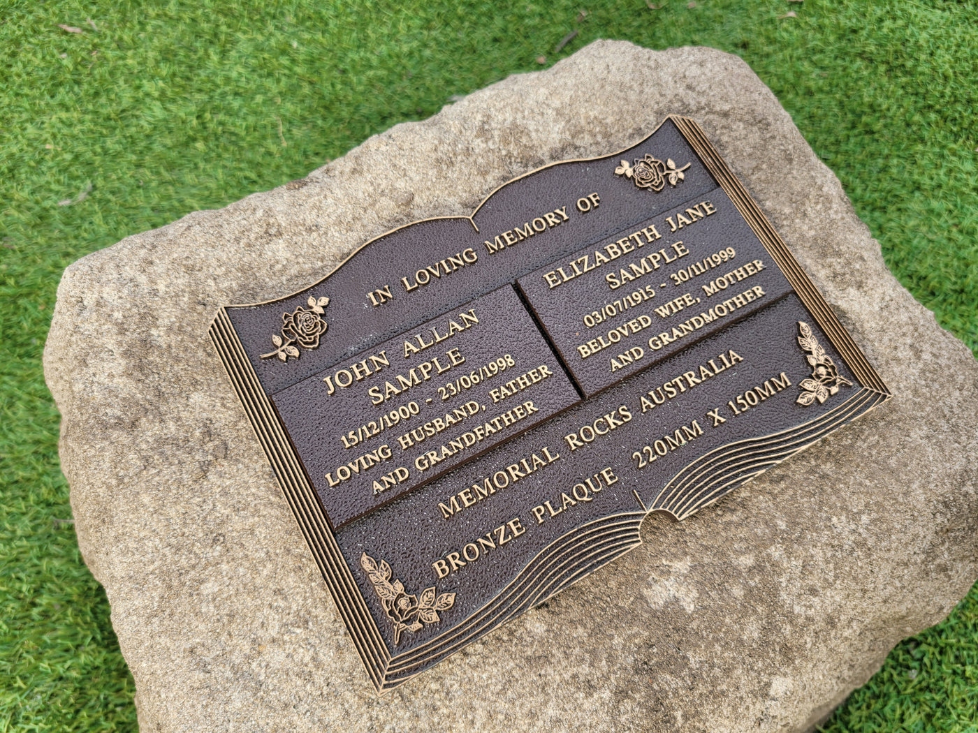 This Memorial Rock Urn has a useable flat section up to 220mm x 150mm for a quality bronze plaque or 2 smaller plaques (to perhaps accommodate a 2nd plaque at a much later time) and or a picture. Suggested size for a single plaque 200mm x150mm. SOLD SEPARATELY.