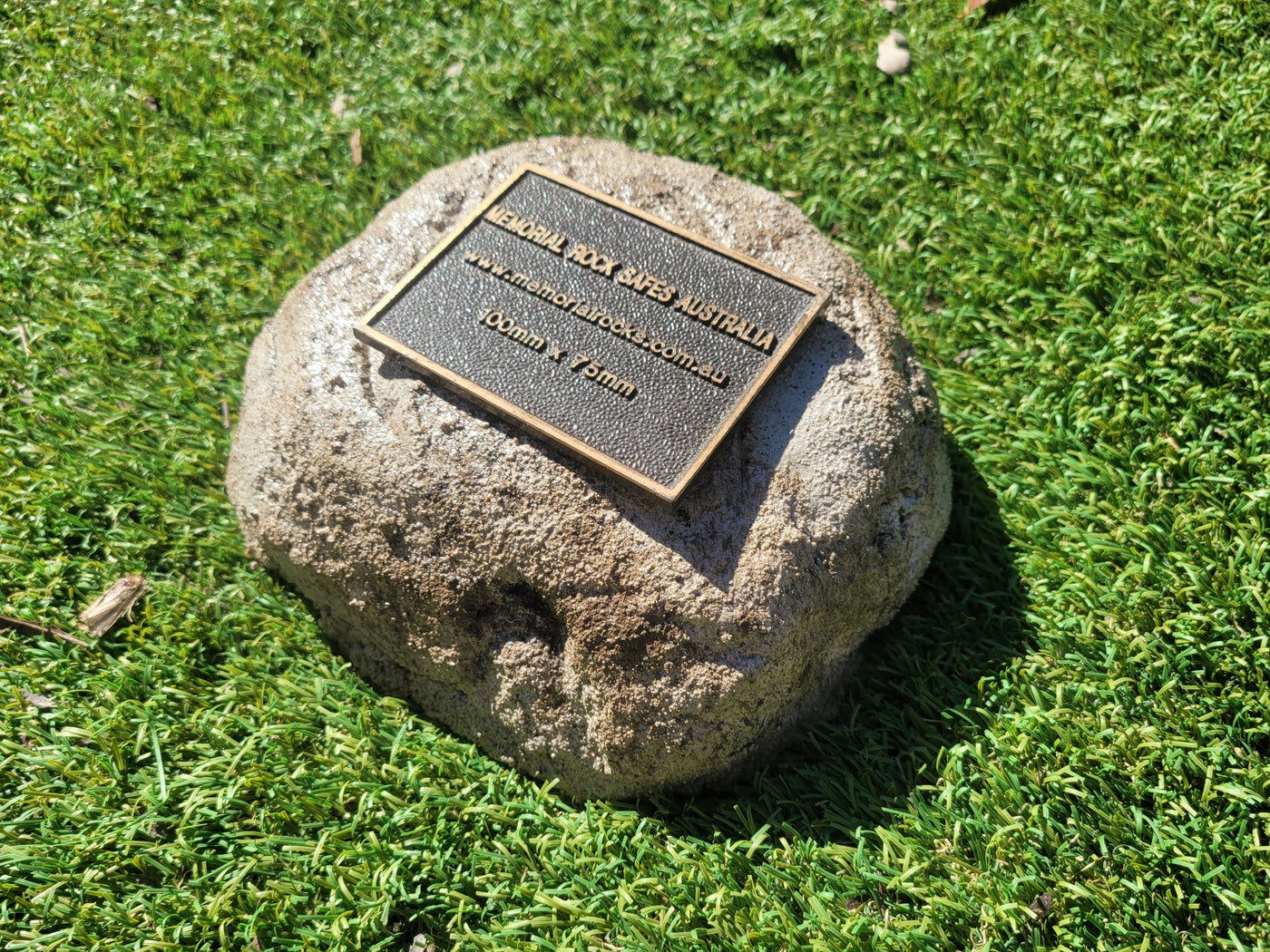 Memorial Rock Urns are a loving practical alternative for the safe keeping of a loved one's ashes. This Memorial Rock Urn has a small internal sealed container for partial ash interment. This Partial Ash Urn Memorial rock has an incorporated flat space for a industry standard bronze plaque 80 mm x 40mm x4.5mm or a 150mm x 100mm x 4.5 mm hear...