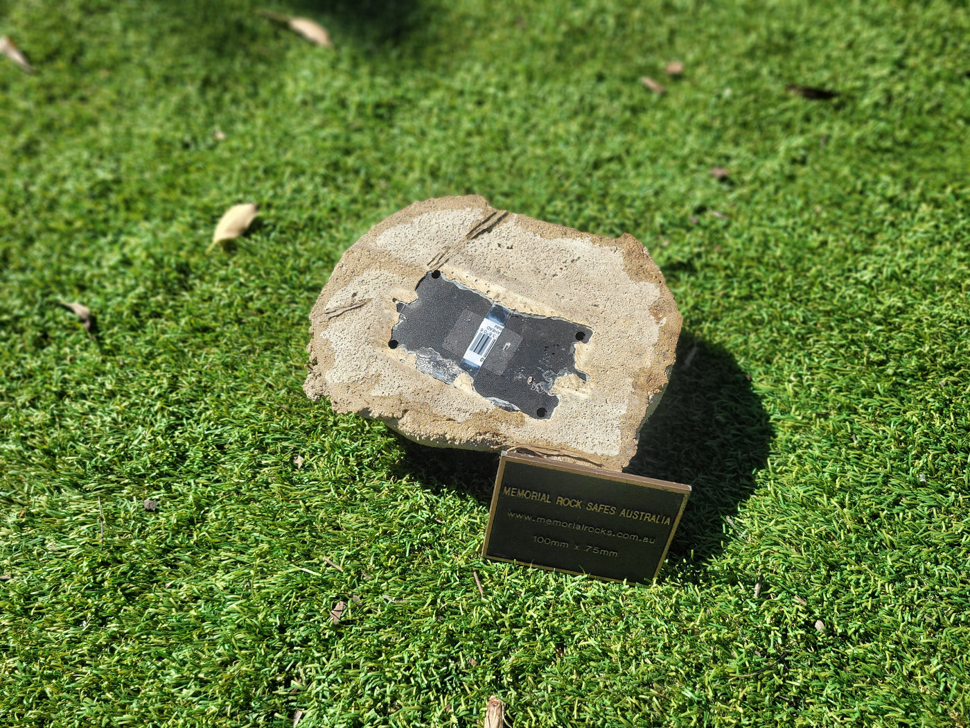 Memorial Rock Urns are a loving practical alternative for the safe keeping of a loved one's ashes. This Memorial Rock Urn has a small internal sealed container for partial ash interment. This Partial Ash Urn Memorial rock has an incorporated flat space for a industry standard bronze plaque 80 mm x 40mm x4.5mm or a 150mm x 100mm x 4.5 mm hear...