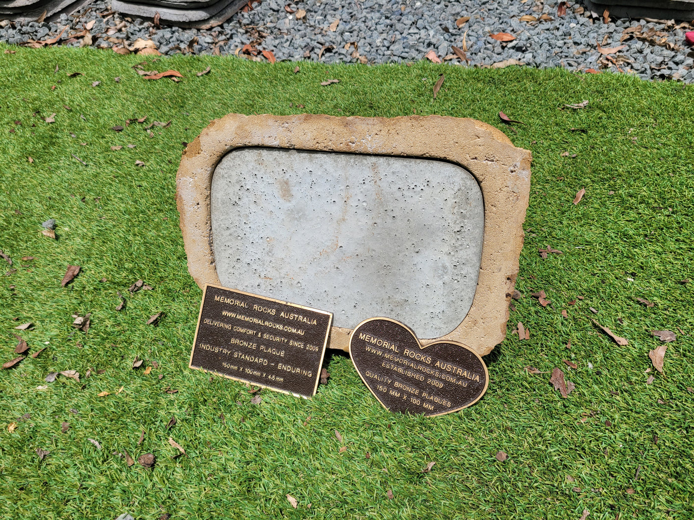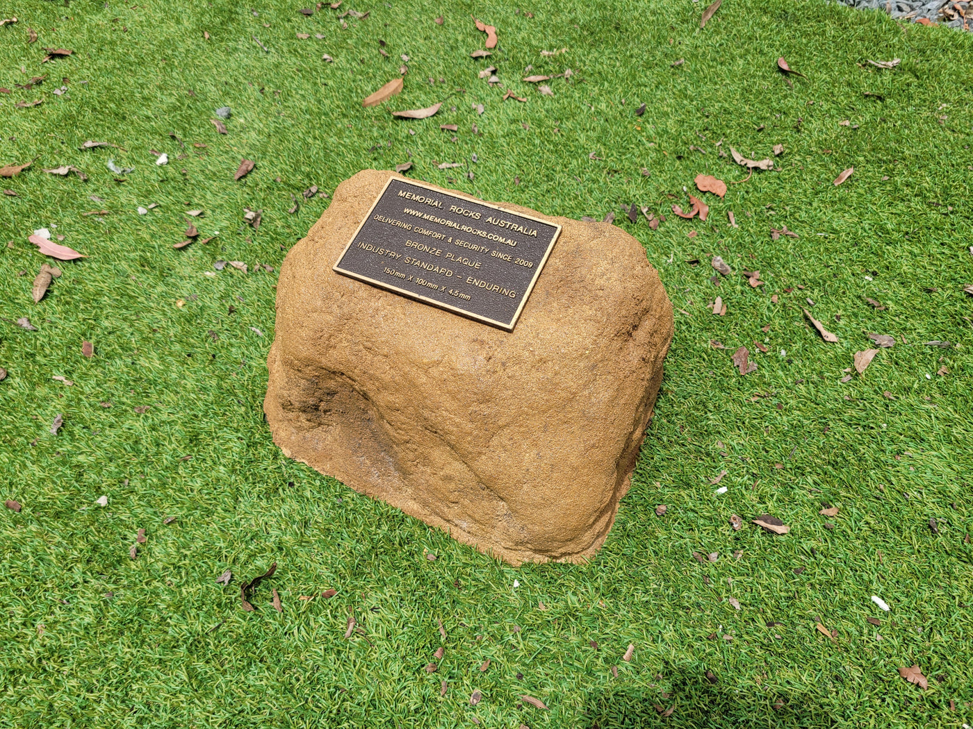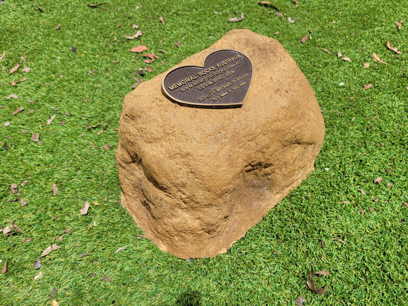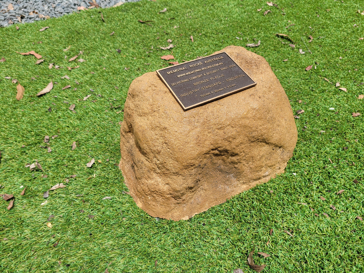 A high quality bronze plaque of your choice can also be purchased and can affixed prior to shipping if you wish.  A 150mm x 100mm x 4.5 mm Plaque is the correct size plaque for the regular sized Memorial Rock Urn.