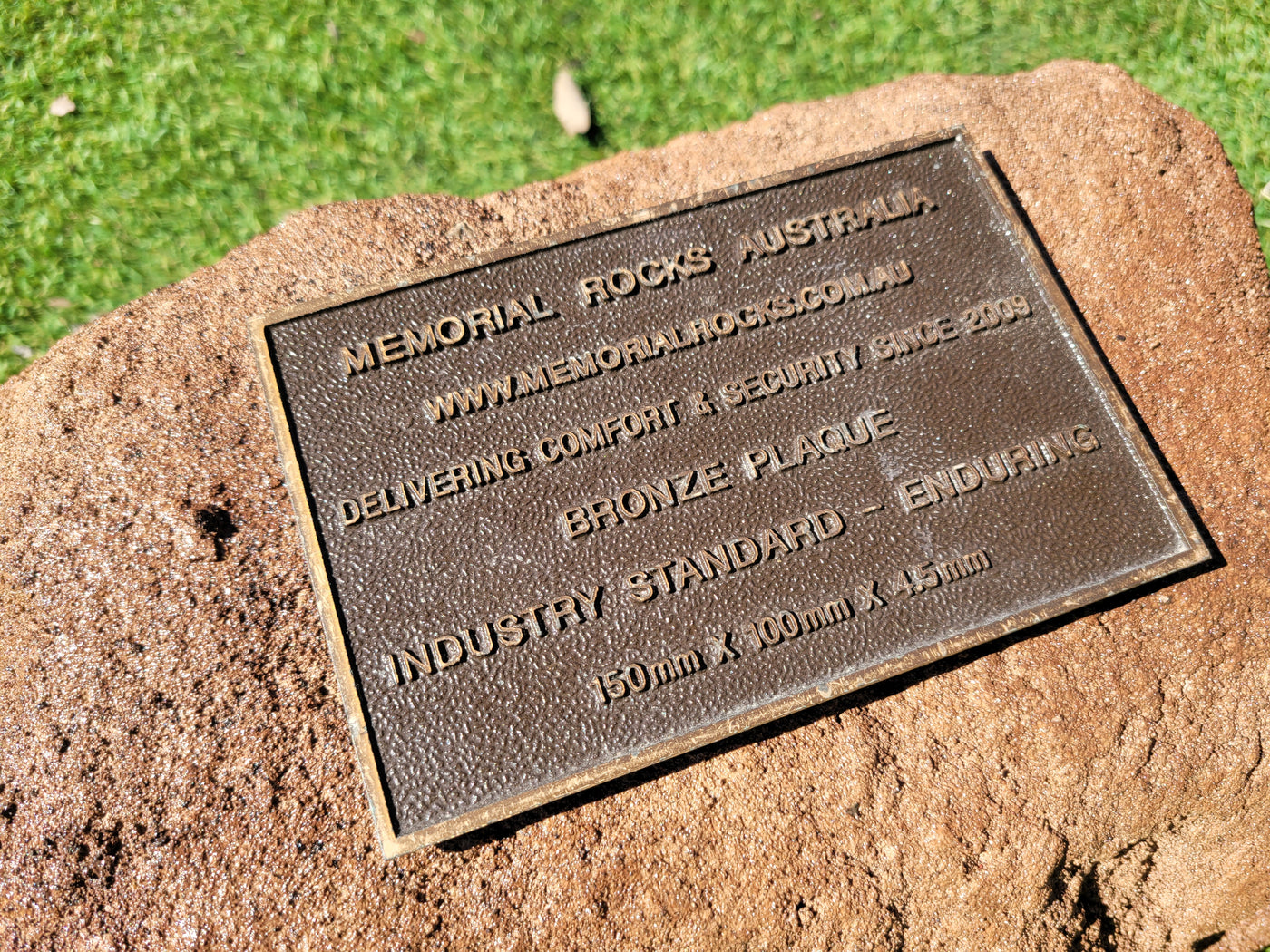 This Memorial rock has an incorporated  flat space for a 150mm x 100mm x4.5mm industry standard  bronze plaque.