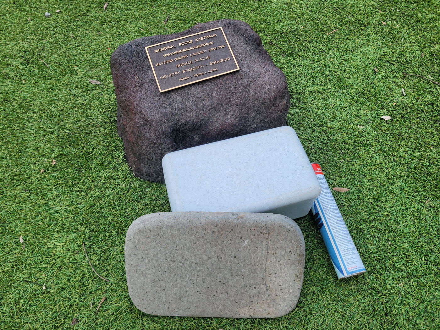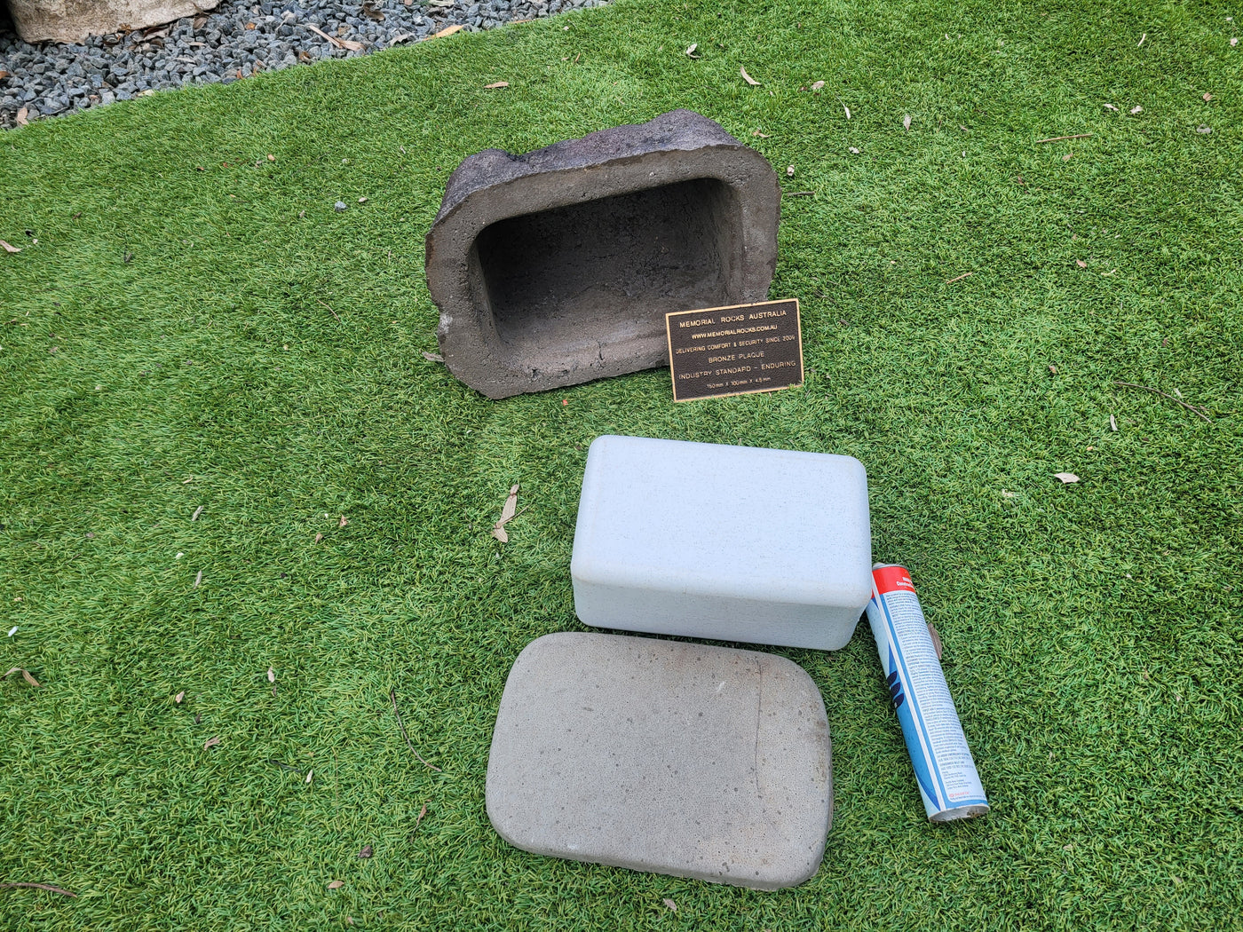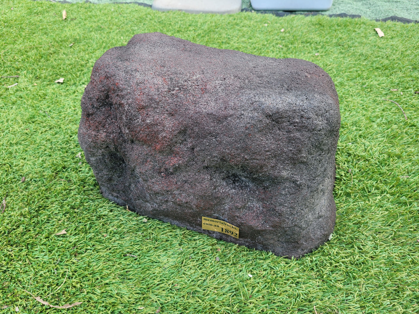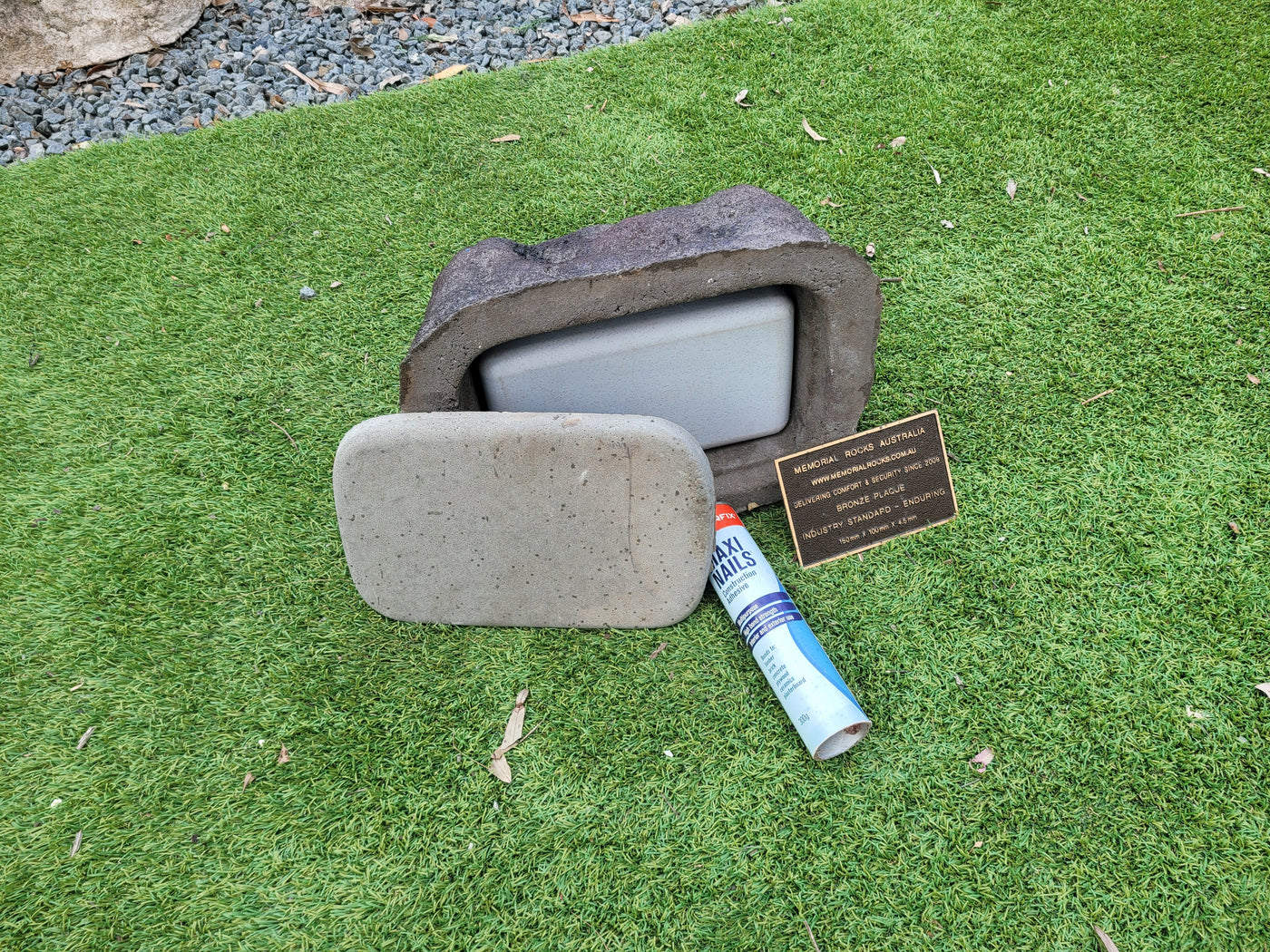 Lightweight (approx. 12 kg) Memorial Rock/Stone/Urn with a sealable internal cavity for the safe-keeping of a loved one's ashes. Holds one standard Australian sized ash container. (250mm x 150mm x 120mm)